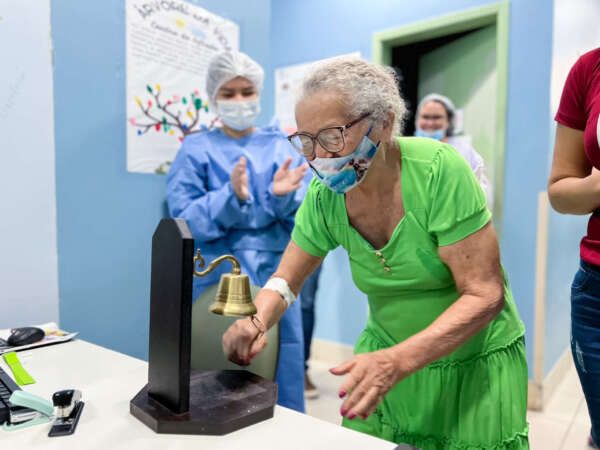 Responsável por toda a parte operacional do Centro de Infusão, a Enfermagem atua diariamente no espaço para garantir segurança e conforto aos pacientes. Quando um paciente recebe alta, a equipe o leva para bater o sino de comemoração. “Muitos chegam chorando, mas a gente trabalha para que eles saiam sorrindo. Essa humanização faz toda a diferença”, pontua Iracema Ribeiro, coordenadora de Enfermagem do serviço. “Ver uma alta é emocionante porque a vitória deles também é uma vitória nossa”, completa.